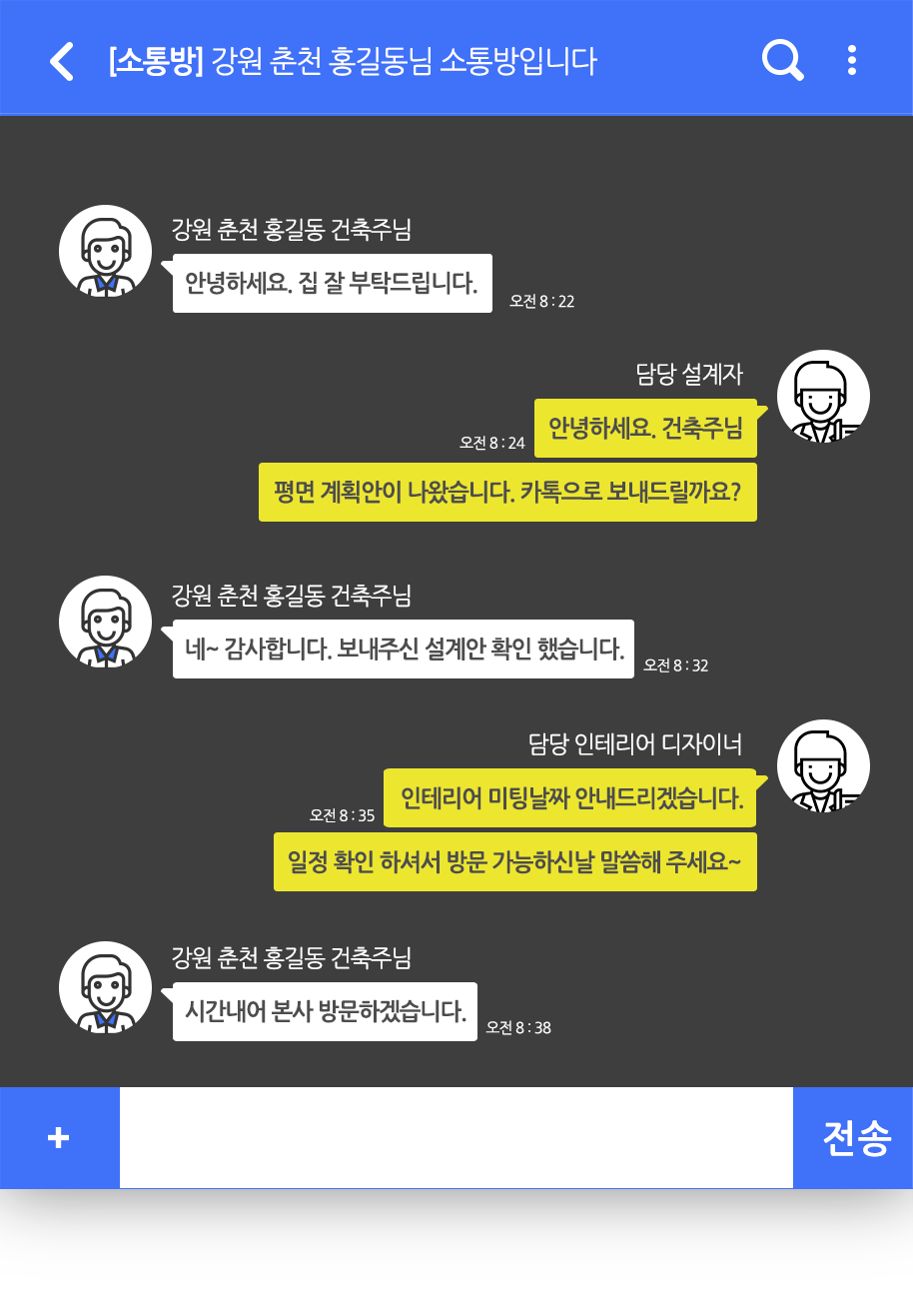 중요하게 생각합니다. 계약 후 진행사항에 관해 궁금하신 점에 대하여 빠르고 쉽게 응답해 드릴 수 있도록 건축주님을 포함해