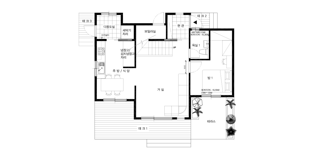 Floor Plan| 1F | 1층 구성: 거실, 주방/식당, 다용도실, 침실1, 욕실, 현관, 보일러실 |