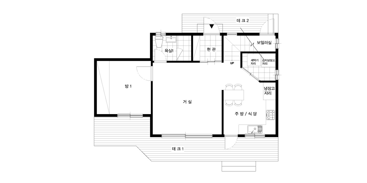Floor Plan| 1F | 1층 구성: 침실1, 거실, 주방/식당, 다용도실, 욕실, 현관, 보일러실 |