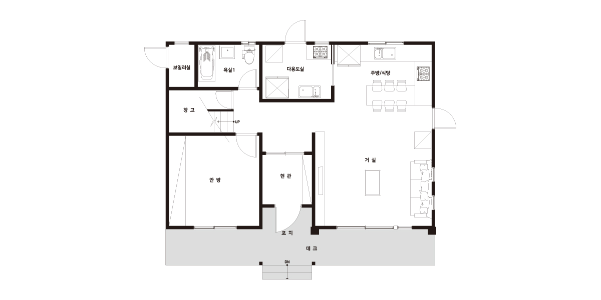 넓은 거실과 주방, 간결한 동선이 포인트인 주택입니다.