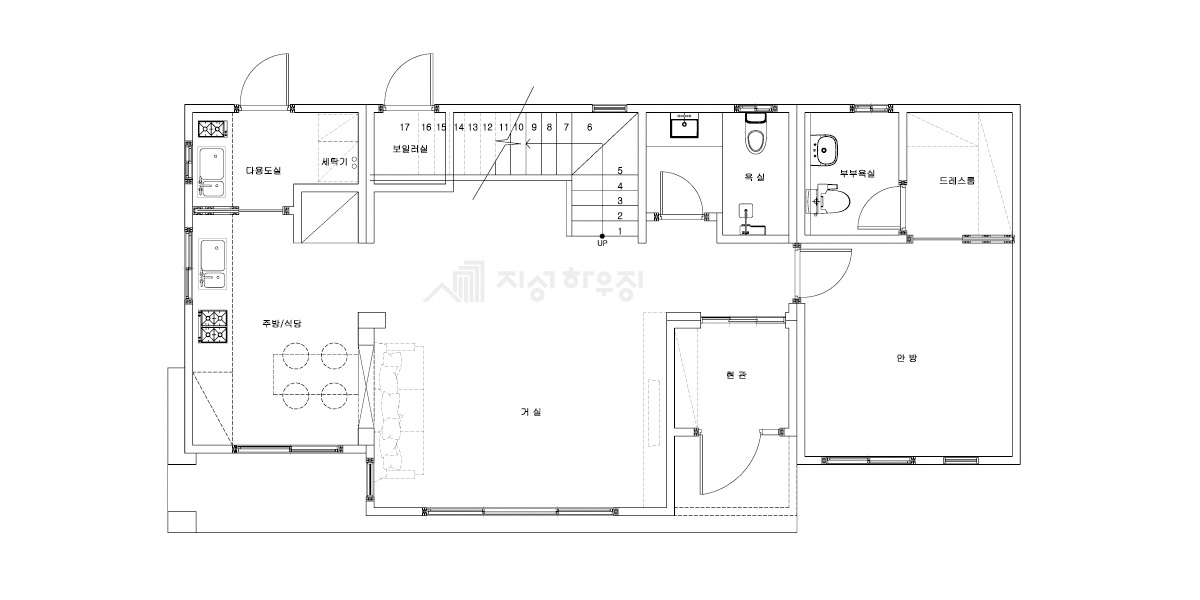 Floor Plan| 1F | 1층 구성: 거실, 주방/식당, 다용도실, 보일러실, 욕실, 현관, 안방, 부부욕실, 드레스룸 |