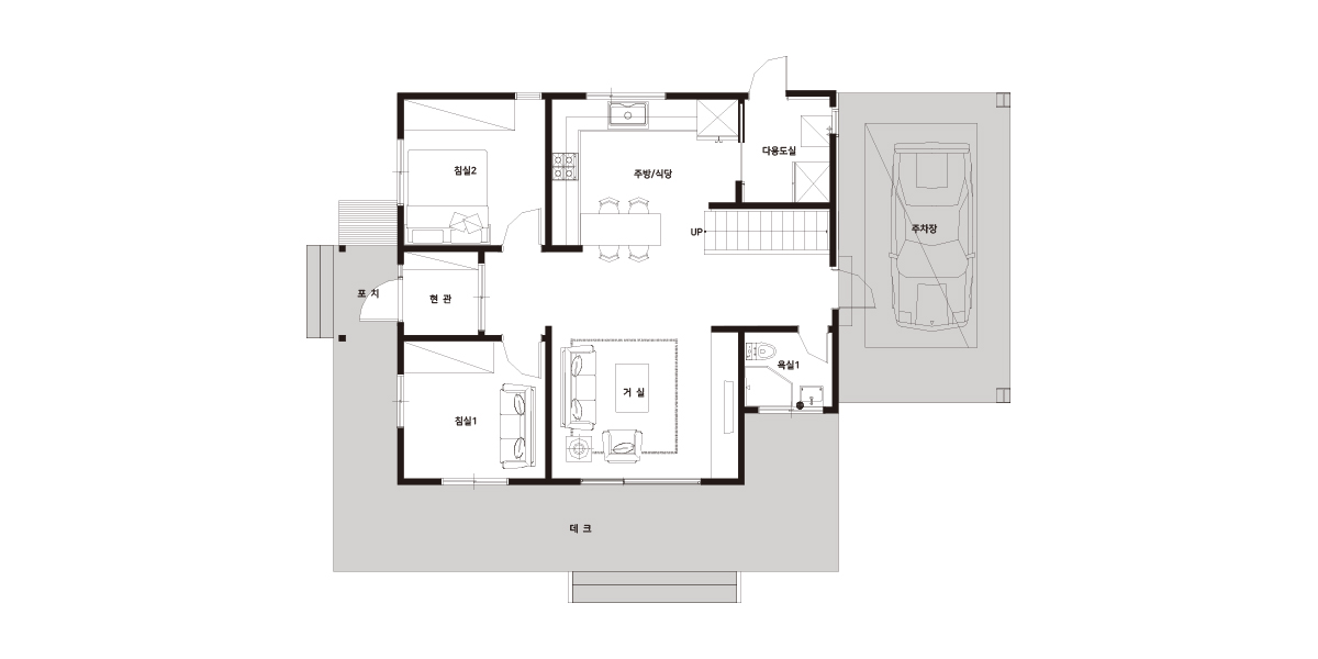 Floor Plan| 1F | 1층 구성: 현관, 거실, 주방/식당, 침실1, 침실2, 욕실1, 다용도실 |