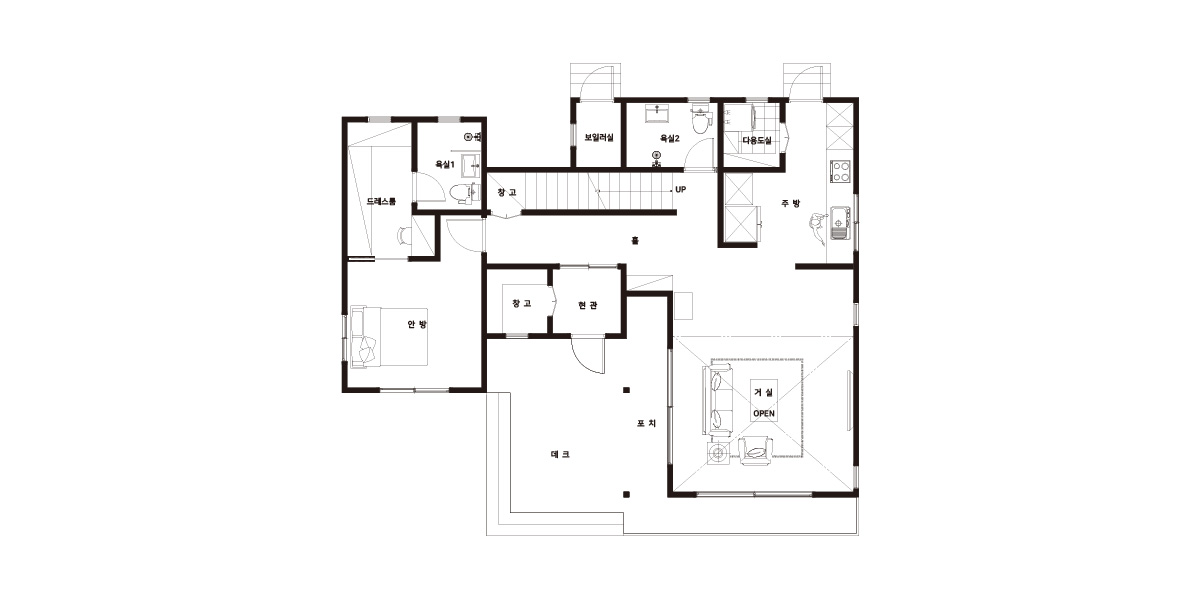 | 1층포치 / 데크 | 9.22㎡ (2.79py) / 19.34㎡ (5.85py) | 창호 | 시스템창호 |