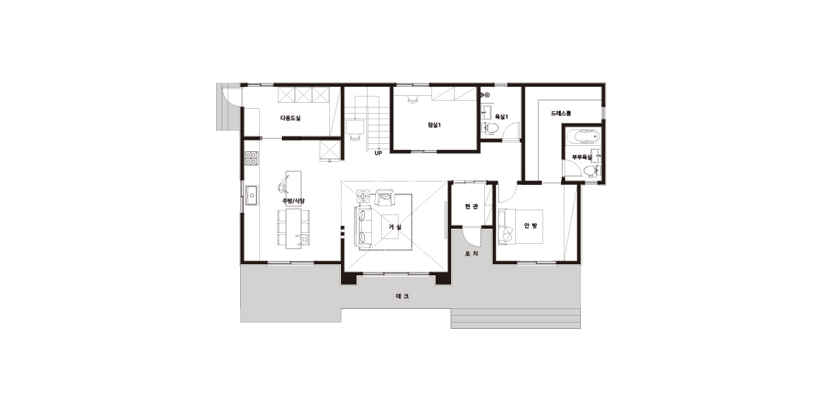Floor Plan| 1F | 1층 구성: 현관, 거실, 주방/식당, 다용도실, 안방, 드레스룸, 부부욕실, 침실1, 욕실1 |