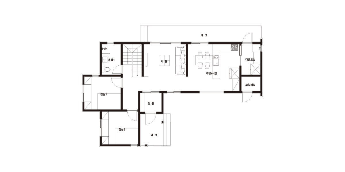 ㄱ자 형태로 개인공간과 공용공간이 분리된 구조입니다.