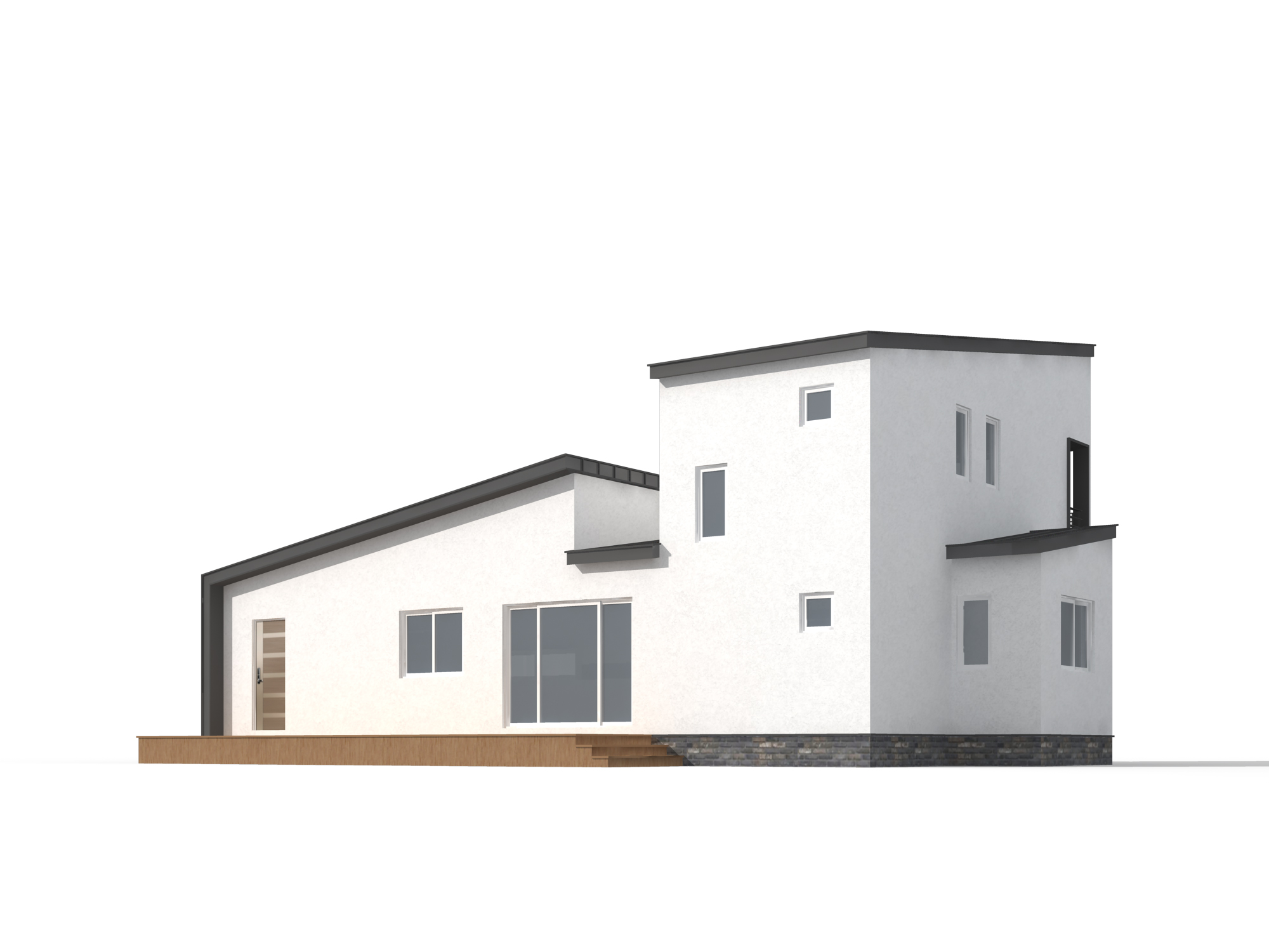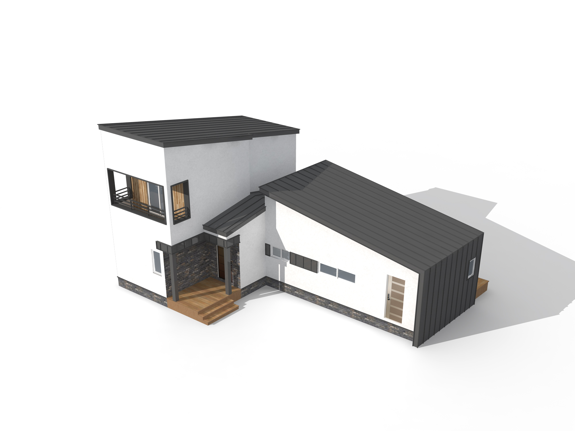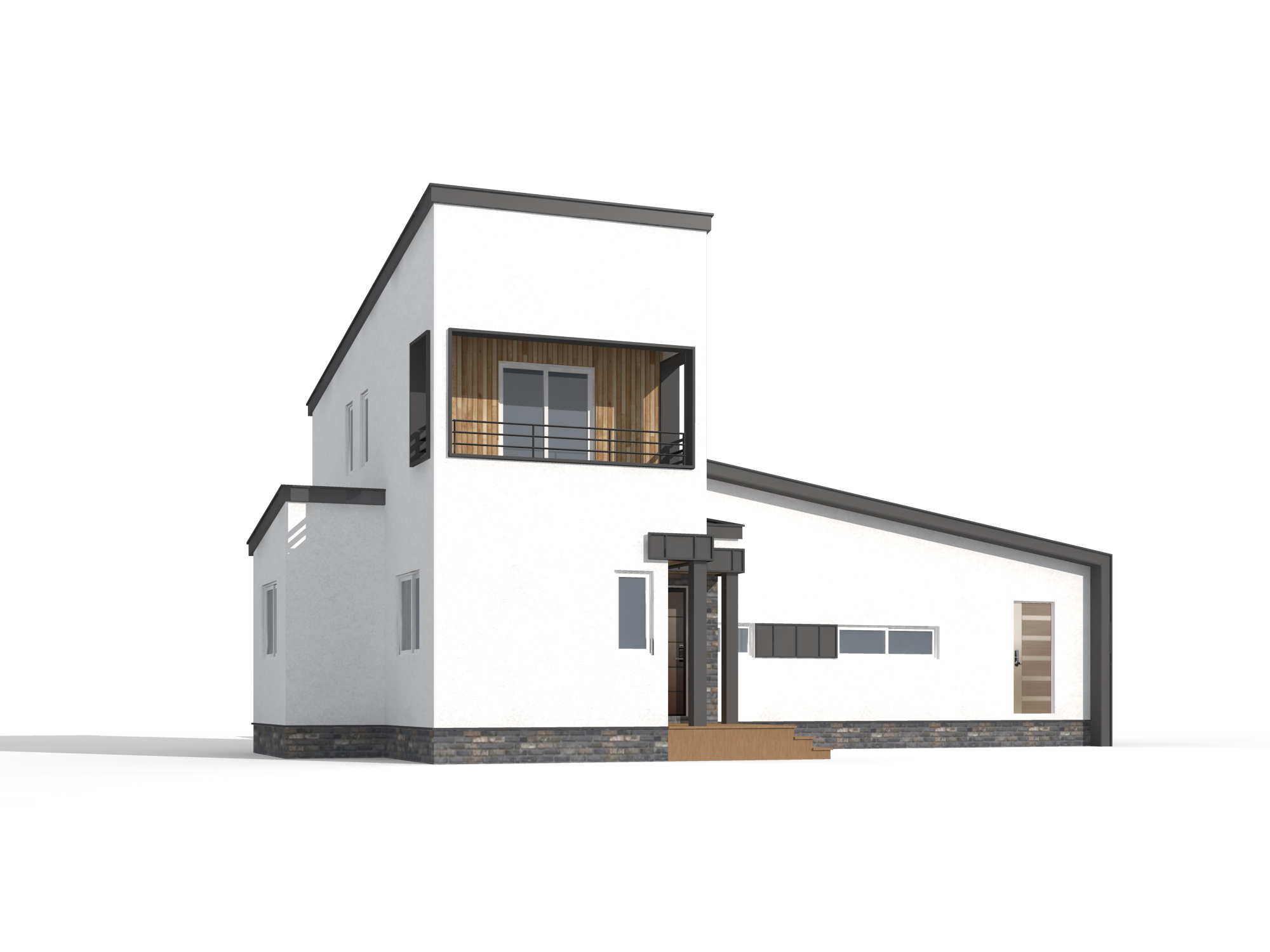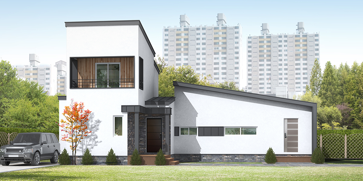 징크로 마감된 지붕과 순백색 스타코가 어우러진 모던스타일 주택입니다.