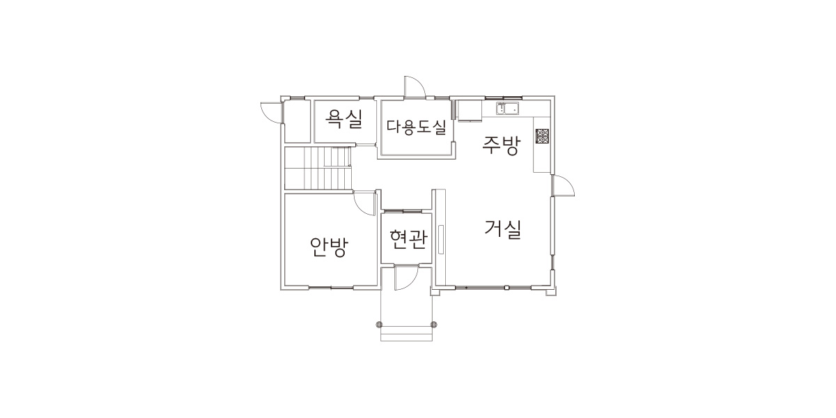 Floor Plan| 1F | 1층 구성: 현관, 거실, 주방, 다용도실, 욕실, 안방 |