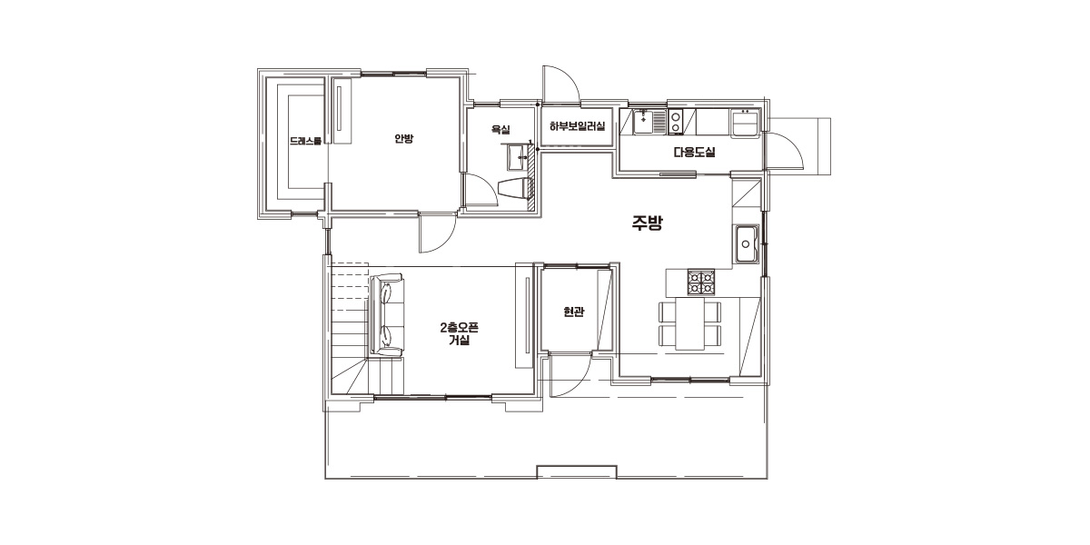 Floor Plan| 1F | 1층 구성: 현관, 거실, 안방, 욕실, 다용도실, 하부보일러실, 주방, 드레스룸 |