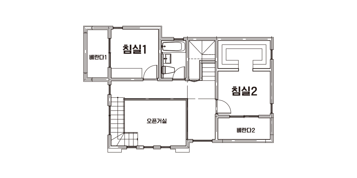 | 2F | 2층 구성: 베란다1, 침실1, 침실2, 베란다2, 오픈거실, 화장실 |