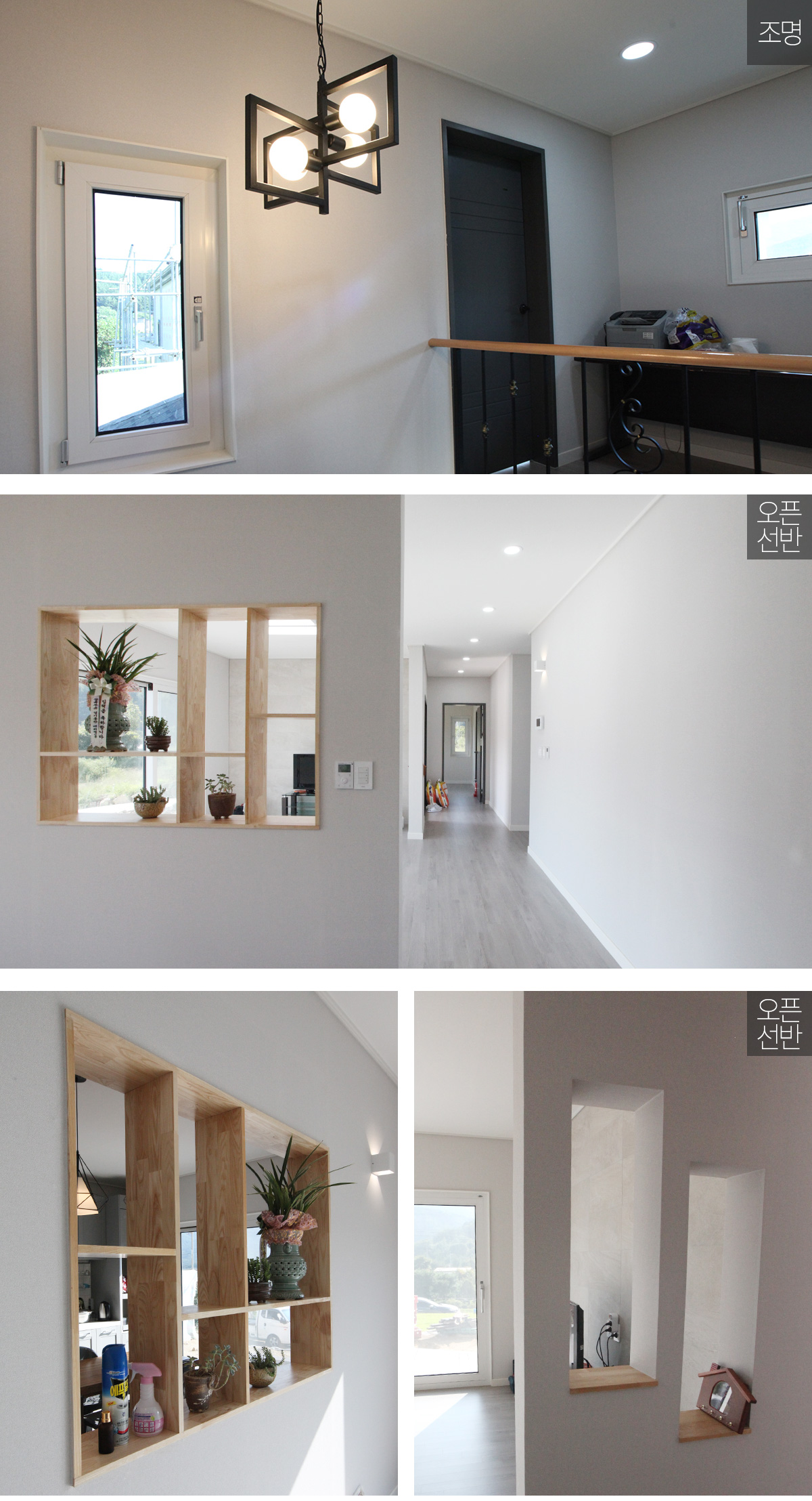 거실 오픈선반으로 주방과 거실에 연결성을 주는 동시에