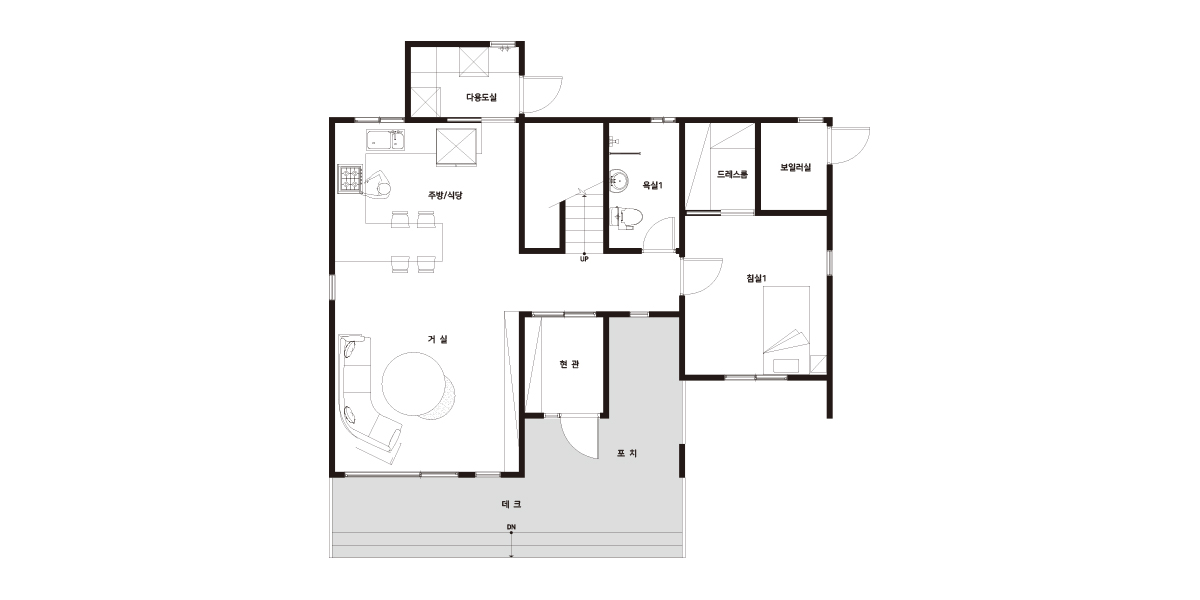 Floor Plan| 1F | 1층 구성: 거실, 주방/식당, 현관, 욕실, 침실1, 드레스룸, 창고/보일러실 |