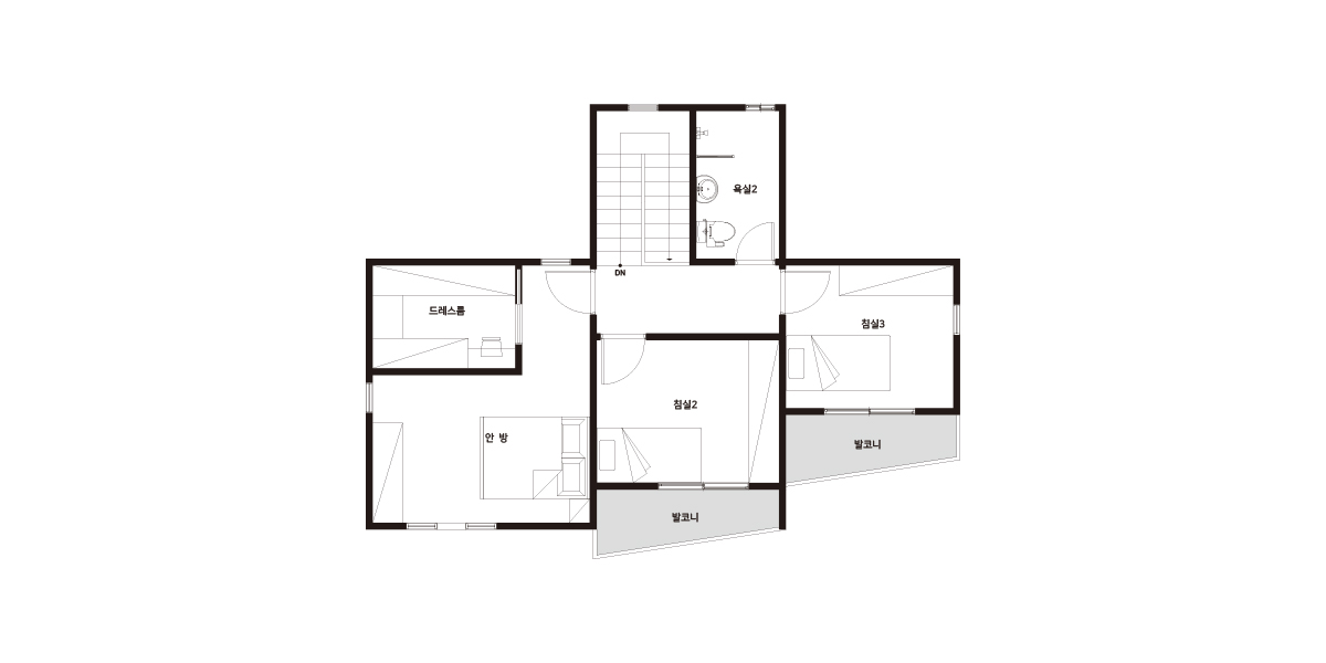 2층 각 실에 발코니를 두어 외부공간과의 연계 강조