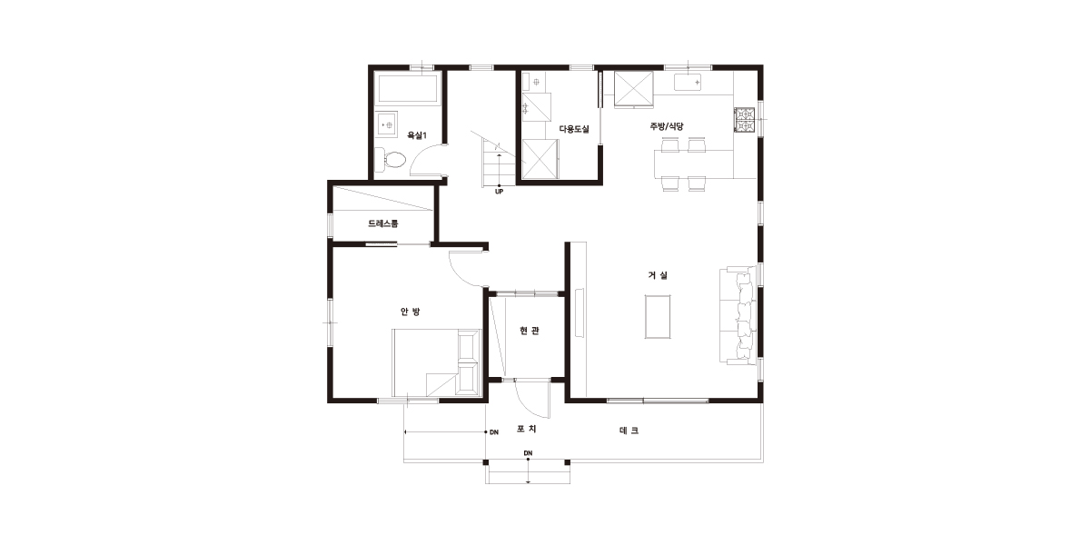 Floor Plan| 1F | 1층 구성: 거실, 주방/식당, 다용도실, 현관, 안방, 드레스룸, 욕실 |