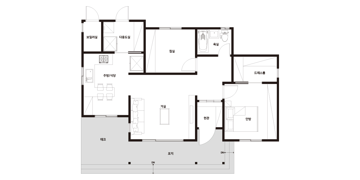 Floor Plan| 1F | 1층 구성: 주방/식당, 다용도실, 보일러실, 거실, 침실, 현관, 안방, 드레스룸, 욕실 |