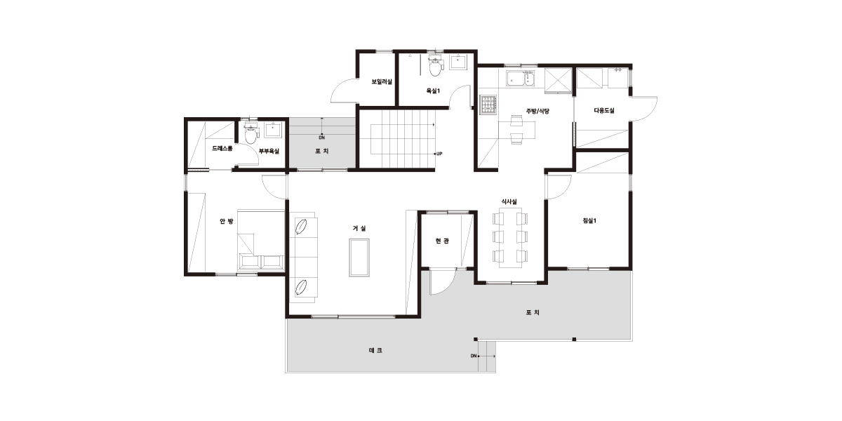 Floor Plan| 1F | 1층 구성: 안방, 드레스룸, 부부욕실, 거실, 현관, 보일러실, 욕실, 식사실, 주방, 침실, 다용도실 |