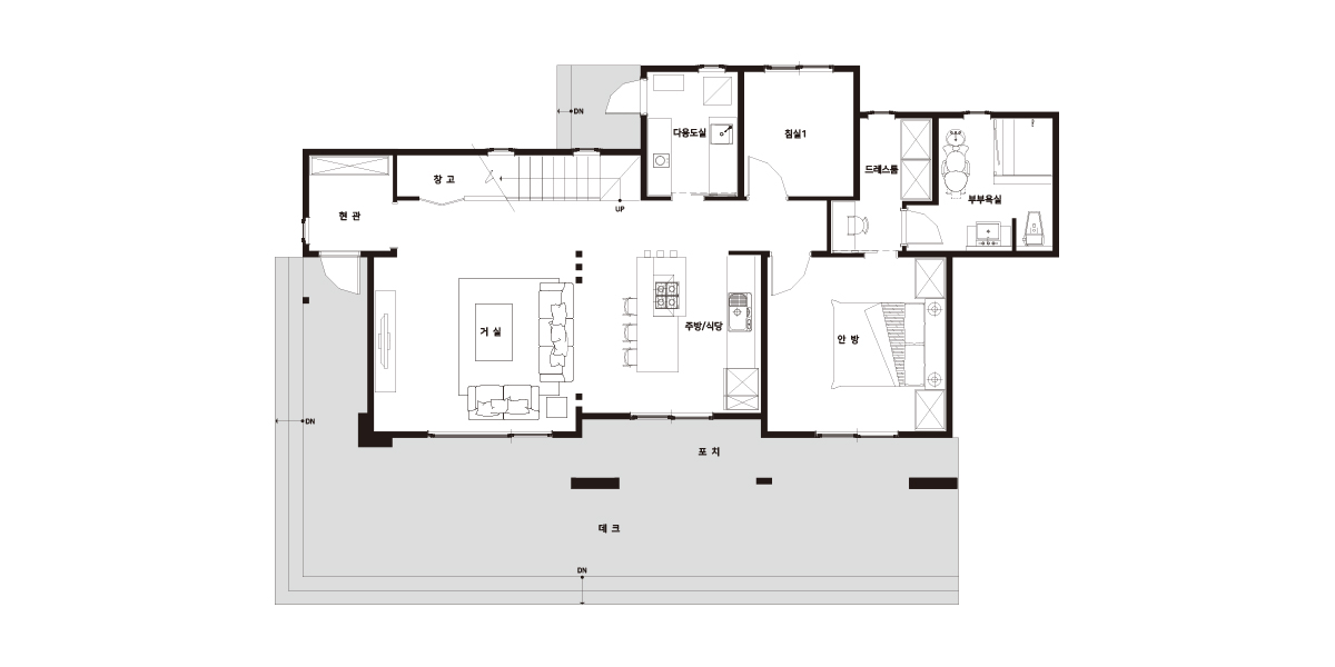 Floor Plan| 1F | 1층 구성: 거실, 주방/식당, 다용도실, 안방, 침실1, 드레스룸, 욕실, 현관, 창고 |