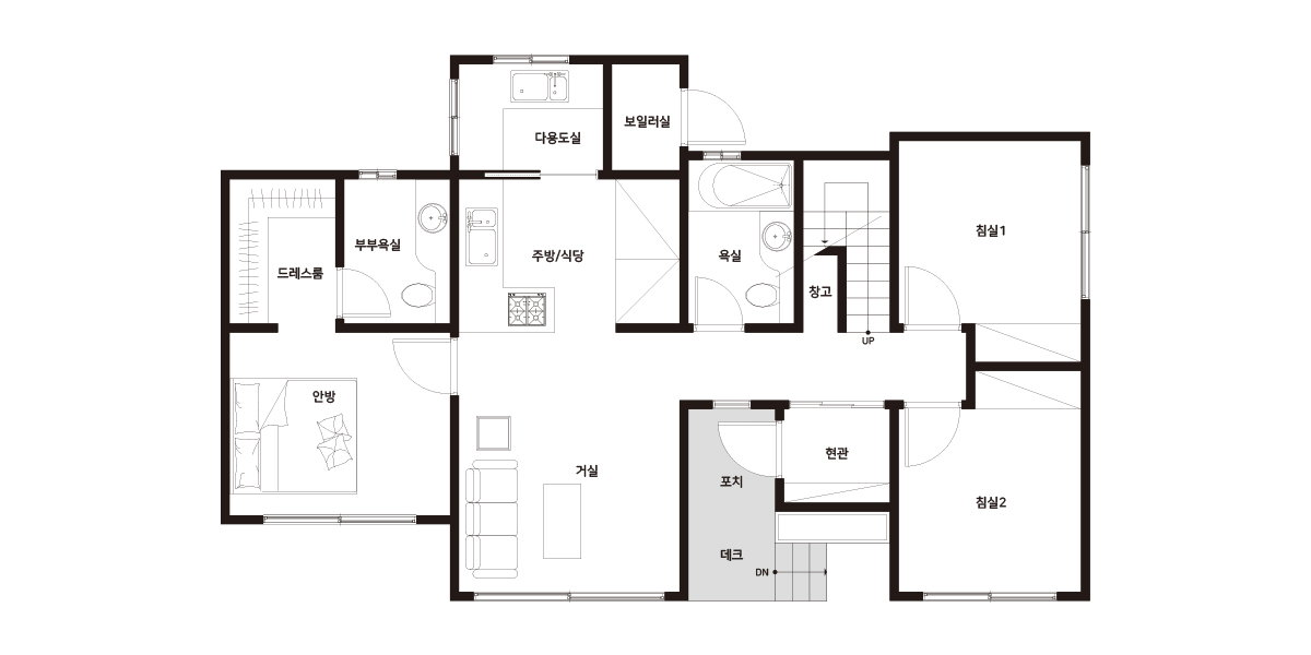 Floor Plan| 1F | 1층 구성: 현관, 안방, 부부욕실, 드레스룸, 침실1, 침실2, 거실, 주방/식당, 욕실, 다용도실, 보일러실 |