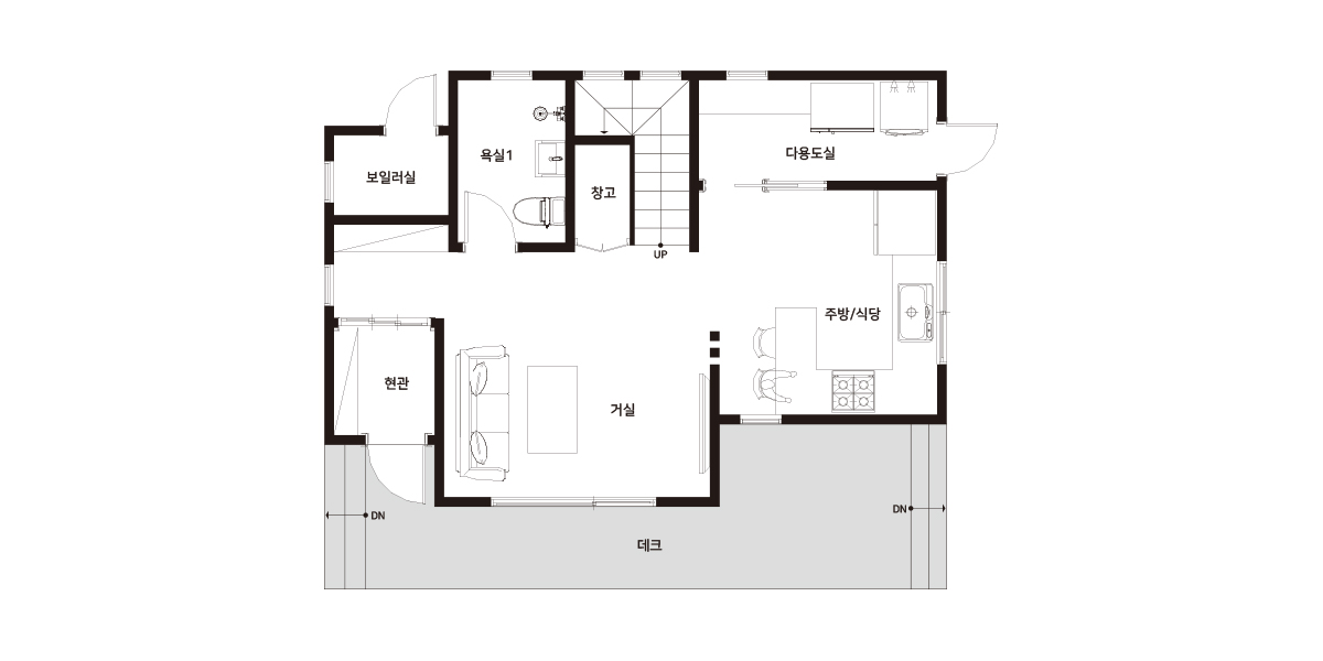 Floor Plan| 1F | 1층 구성: 현관, 거실, 주방/식당, 다용도실, 화장실, 창고, 보일러실 |