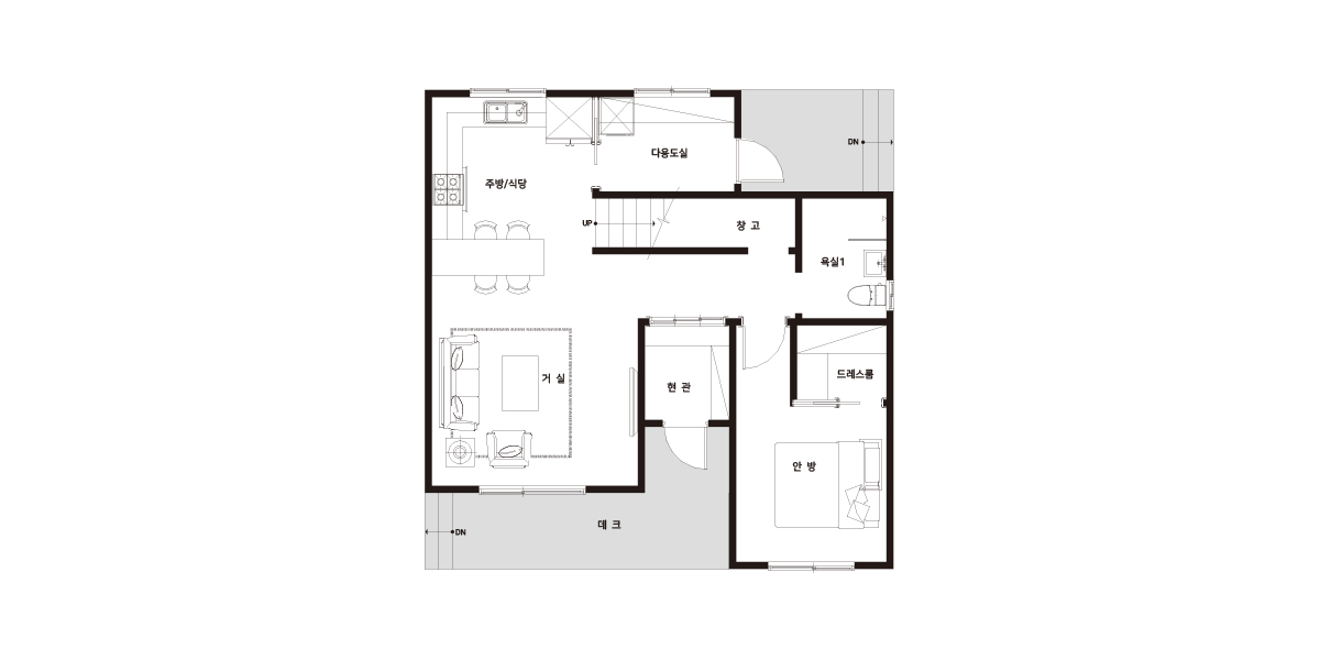 Floor Plan| 1F | 1층 구성: 현관, 거실, 주방/식당, 다용도실, 안방, 드레스룸, 화장실1, 창고 |