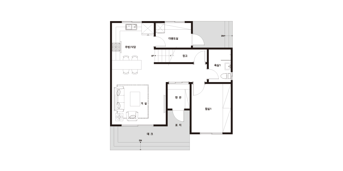 Floor Plan| 1F | 1층 구성: 현관, 거실, 주방/식당, 다용도실, 침실1, 화장실1, 창고 |