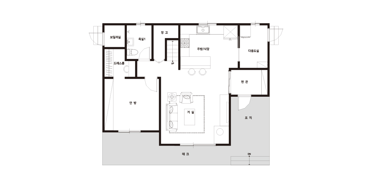 Floor Plan| 1F | 1층 구성: 현관, 거실, 주방/식당, 다용도실, 안방, 드레스룸, 화장실1, 창고, 보일러실 |