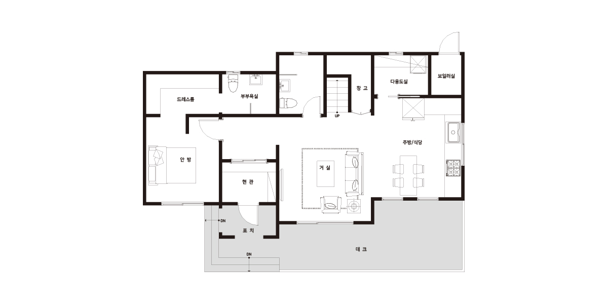 Floor Plan| 1F | 1층 구성: 현관, 거실, 주방, 다용도실, 보일러실, 안방, 드레스룸, 화장실1.2 |