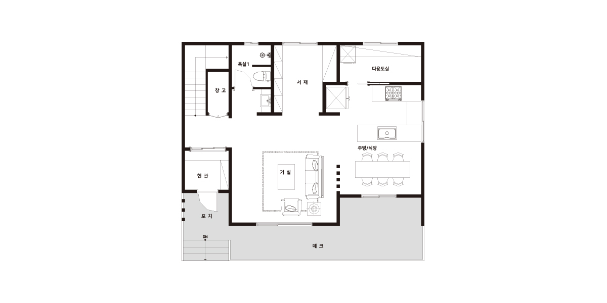 Floor Plan| 1F | 1층 구성: 현관, 거실, 주방/식당, 다용도실, 서재, 화장실1, 창고 |