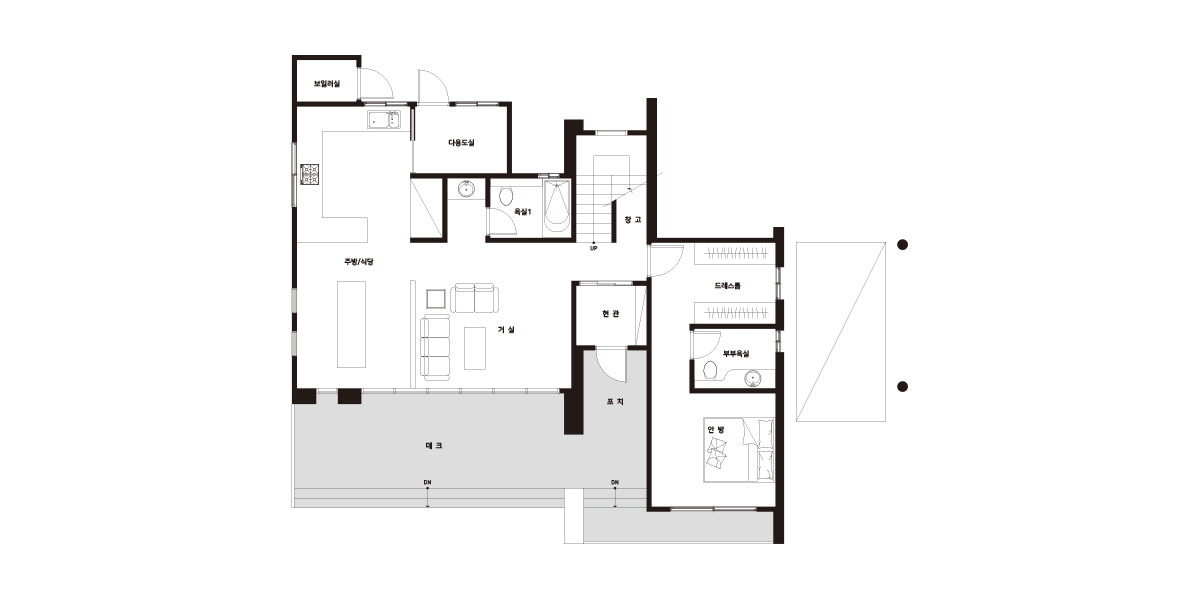| 1층포치 / 데크 | 2.67㎡ (0.81py) / 46.34㎡ (14.02py) | 창호 | 시스템창호 |