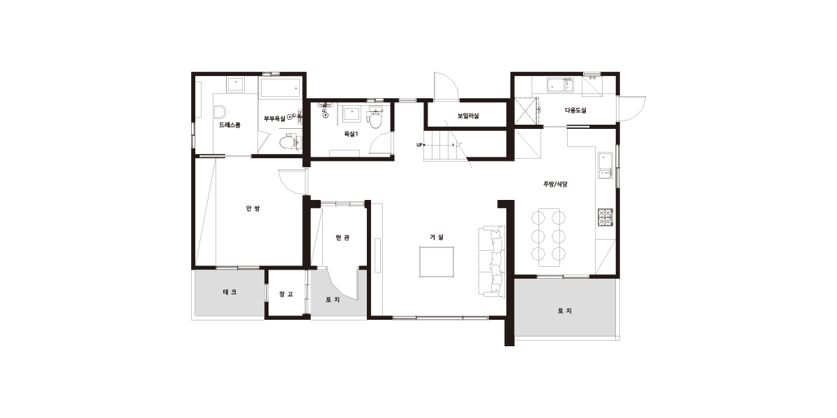 주방 앞의 포치는 주부를 위한 티타임 공간을 두어 안락함을 선사할 것이다.