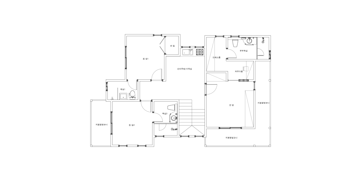 | 2F | 2층 구성: 안방, 드레스룸, 파우더룸, 부부욕실, 침실1, 침실2, 욕실2, 욕실3, 간이주방, 가족실 |