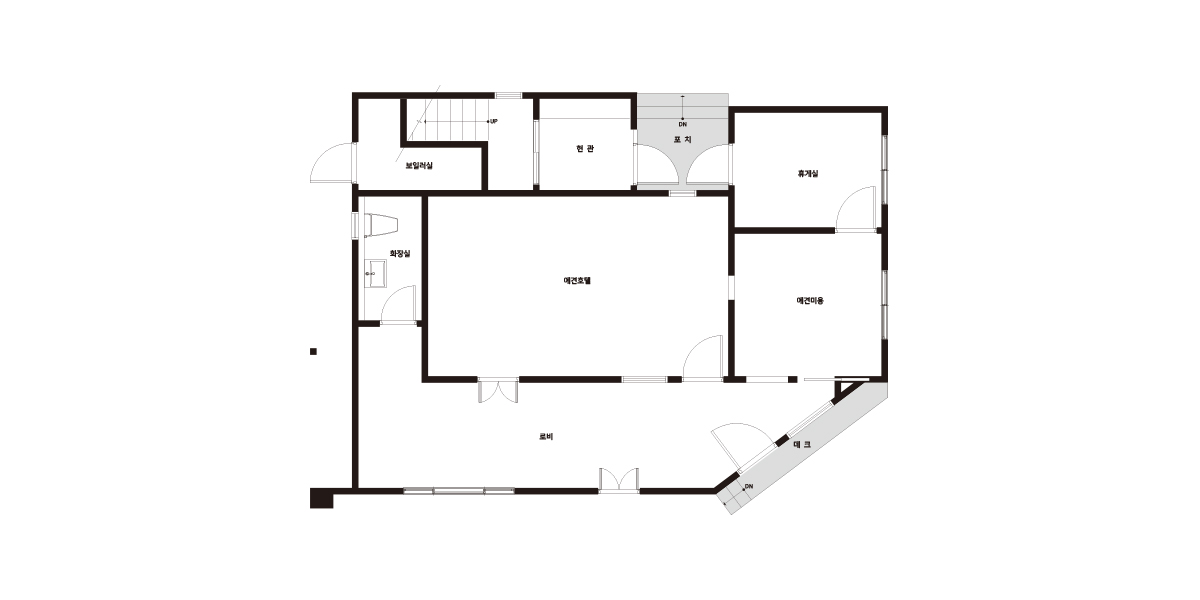 Floor Plan| 1F | 1층 구성: 로비, 애견호텔, 애견미용, 화장실, 휴게실, 현관, 계단실, 보일러실 |