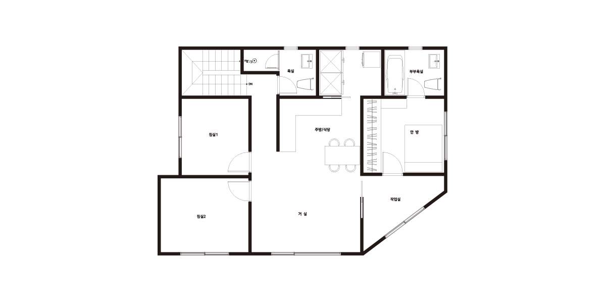 | 2F | 2층 구성: 거실, 주방/식당, 다용도실, 작업실, 안방, 드레스룸, 부부욕실, 욕실, 침실1, 침실2 |