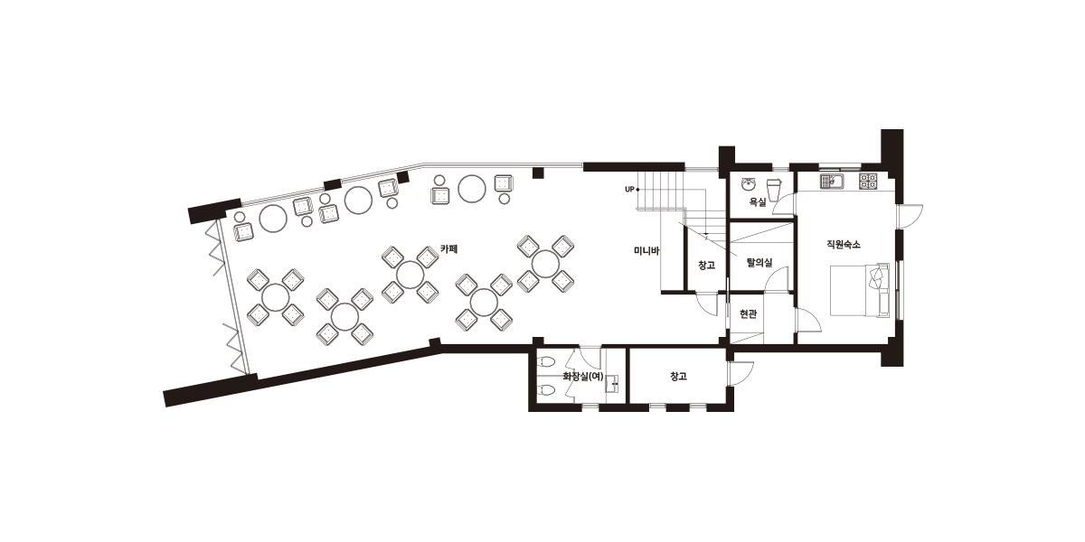 Floor Plan| 1F | 1층 구성: 카페, 화장실, 직원숙소, 창고 |