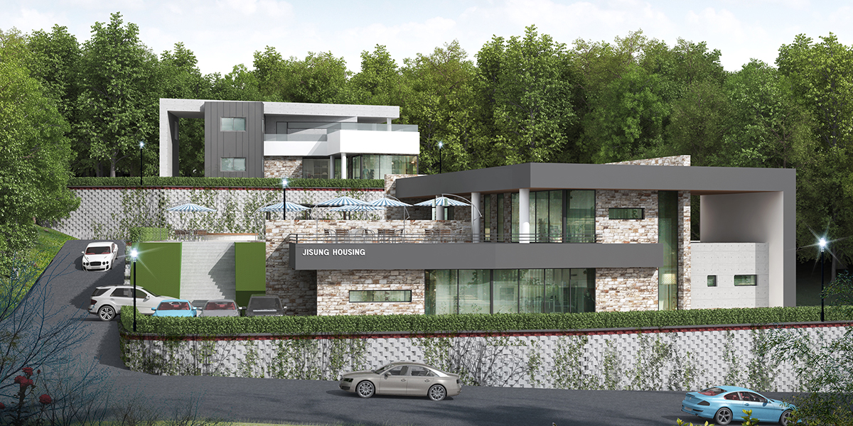 | 2층면적 | 126.77㎡ (38.35py) | 외부마감 | 현무암물갈기, 벽돌, 노출콘크리트 |