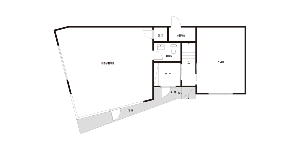 Floor Plan| 1F | 1층 구성: 근린생활시설, 화장실, 창고, 보일러실 / 주인세대 - 현관, 손님방 |