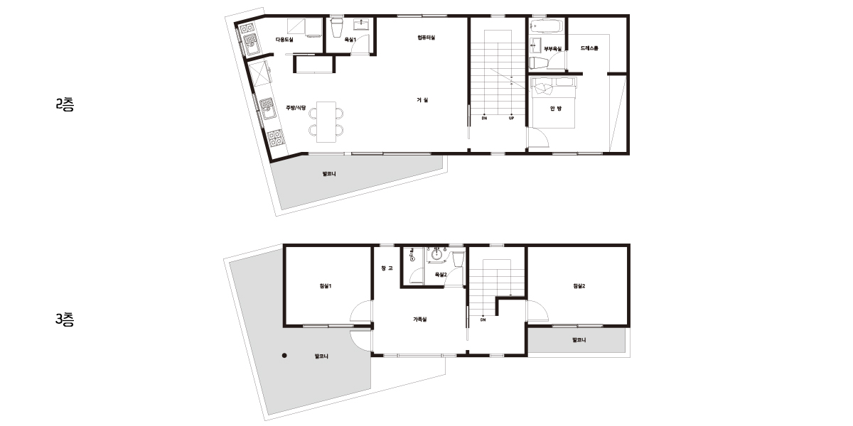 | 2F | 2층 구성: 주인세대 - 거실, 주방, 시당, 다용도실, 컴퓨터실, 안방, 드레스룸, 부부욕실, 욕실1 3층 구성: 주인세대 - 가족실, 침실1, 침실2, 욕실2, 창고 |
