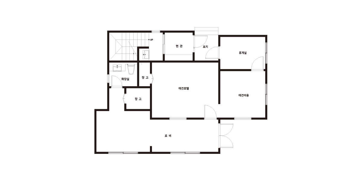 Floor Plan| 1F | 1층 구성: 애견샵 - 로비, 애견호첼, 애견미용, 휴게실, 화장실, 창고 / 주인세대 - 현관 |
