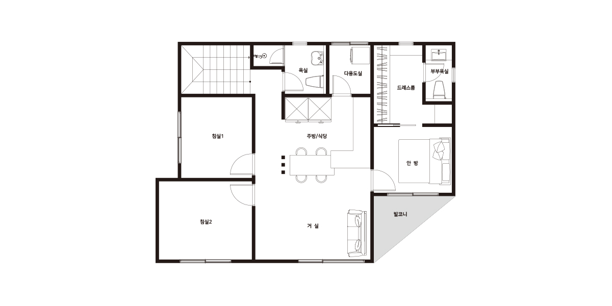 | 2F | 2층 구성: 주인세대 - 거실, 주방, 식당, 안방, 드레스룸, 부부욕실, 다용도실, 침실1, 침실2 |