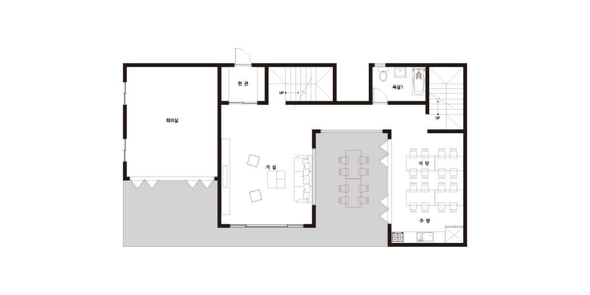 Floor Plan| 1F | 1층 구성: 현관, 거실, 주방, 식당, 욕실1, 회의실, 야외식당 |
