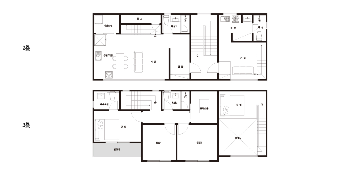 | 2F | 2층 구성: 임대세대1 - 현관, 거실, 주방, 식당, 창고, 다용도실, 욕실 / 임대세대2 - 현관, 거실, 주방, 욕실 3층 구성: 임대세대1 - 안방, 드레스룸, 부부욕실, 침실1, 침실2, 욕실2 / 임대세대2 - 침실 |