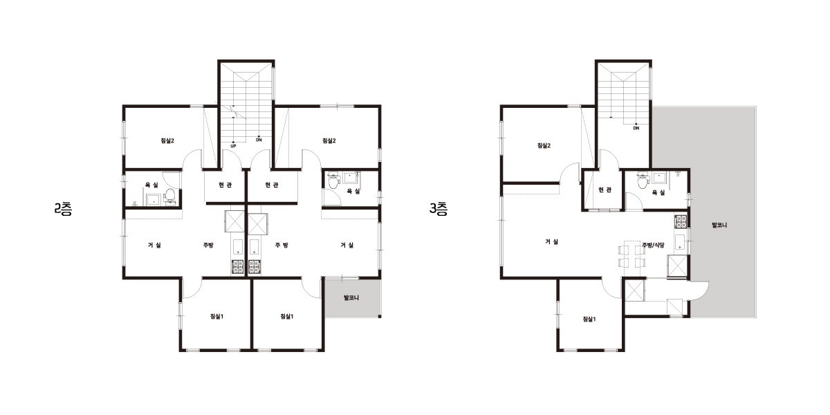 | 2F | 2층 구성: 임대세대 1,2 - 현관, 거실, 주방, 침실1, 침실2, 욕실 / 3층 구성: 주인세대 - 현관, 거실, 주방, 식당, 다용도실, 침실1, 침실2, 욕실 |