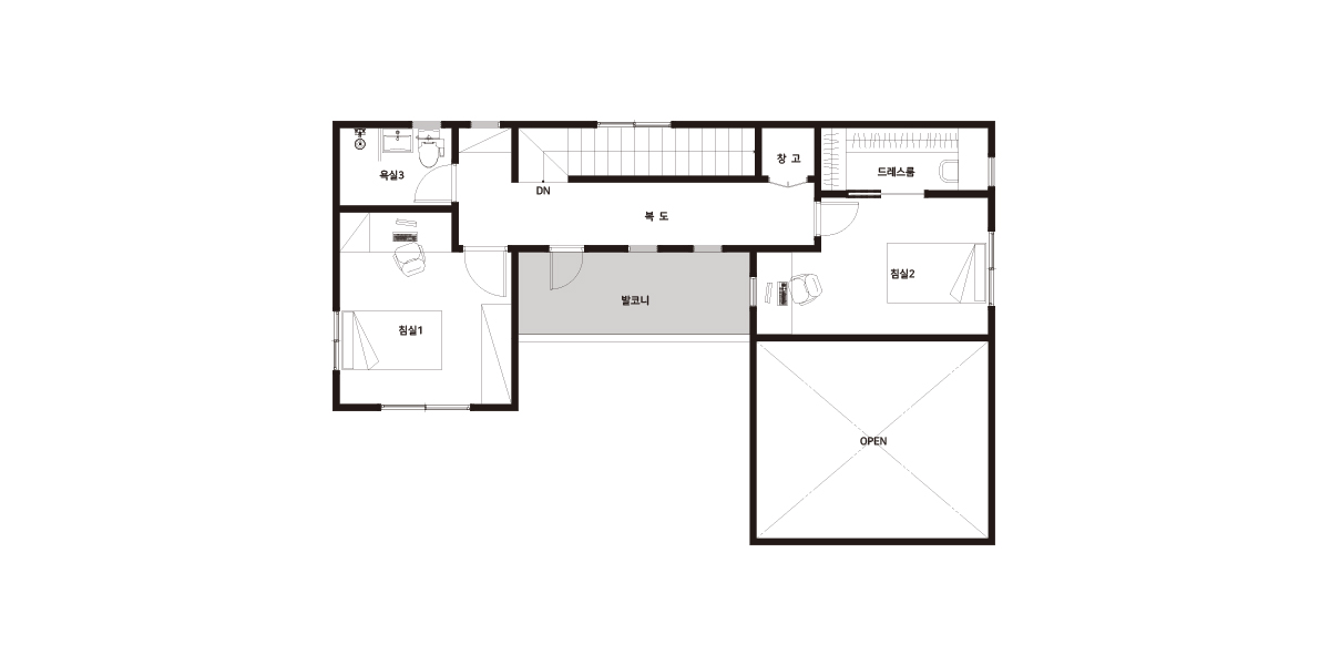 | 2F | 2층 구성: 침실1, 침실2, 욕실3, 드레스룸, 창고 |