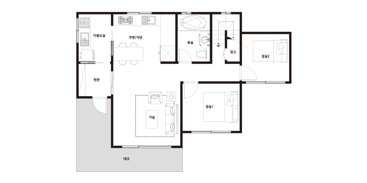 Floor Plan| 1F | 1층 구성: 현관, 거실, 주방/식당, 다용도실, 침실1, 침실2, 욕실, 창고 |