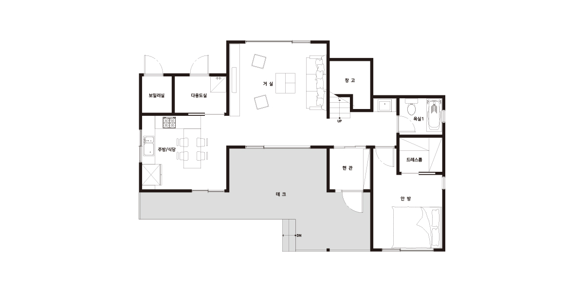 'ㄷ'자 형태 주택으로 주방 및 거실에서 모두 이용가능한 실용적인 중앙 데크