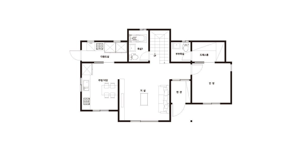 Floor Plan| 1F | 1층 구성: 현관, 거실, 주방, 식당, 안방, 드레스룸, 부부욕실, 다용도실, 욕실1 |