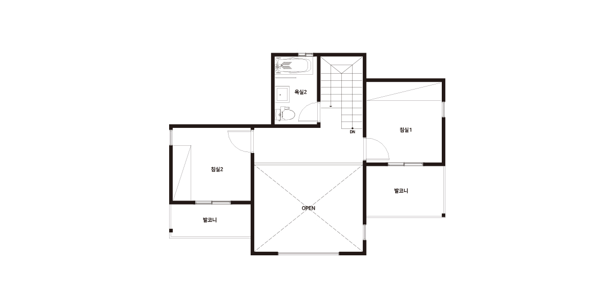 2층 각 방마다 지붕형 발코니를 두어서 프라이버시 공간의 효율성 강조