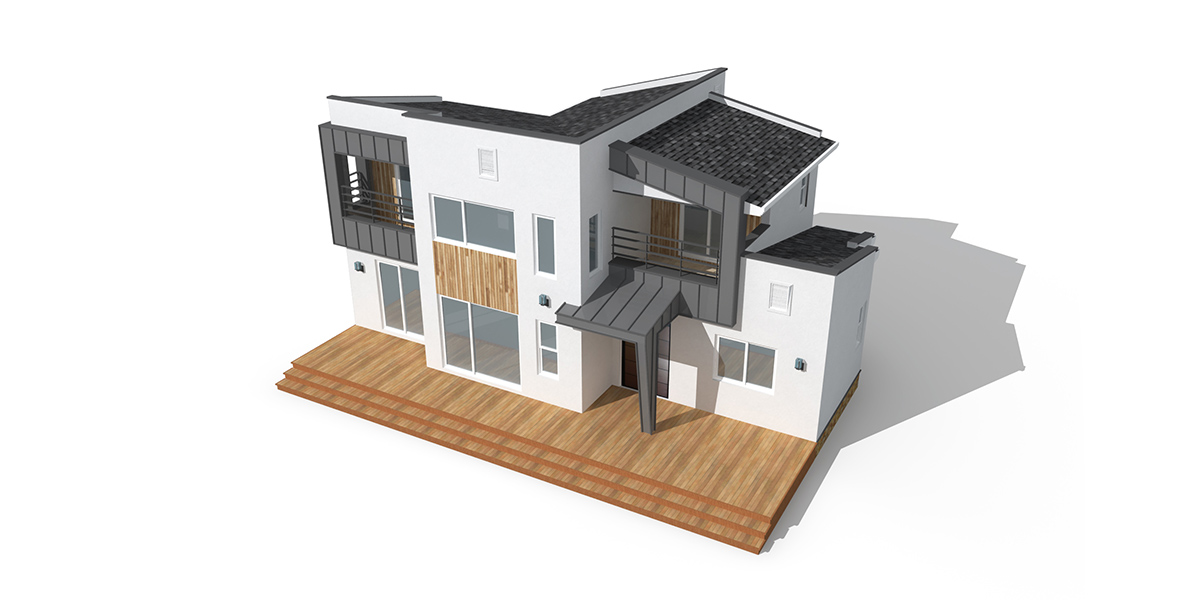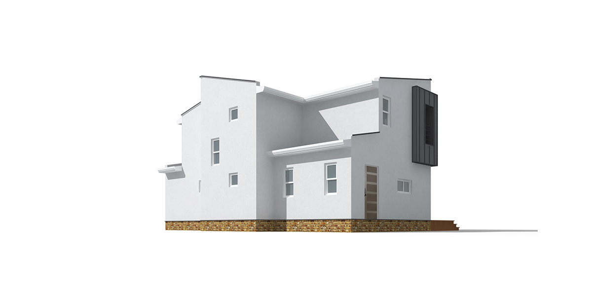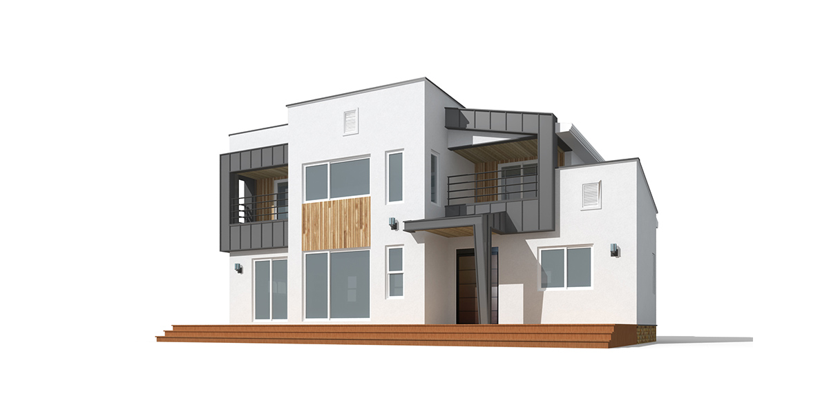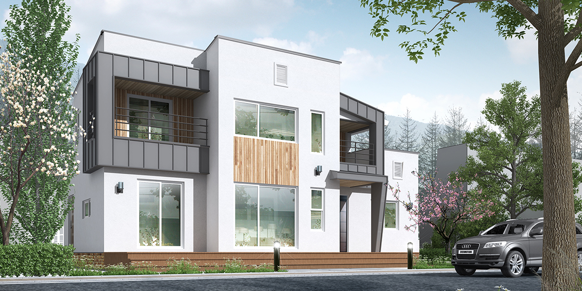 징크와 깔끔한 흰색의 스타코 조합으로 세련되면서도 깔끔한 이미지의 디자인