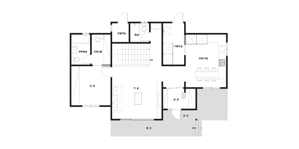 Floor Plan| 1F | 1층 구성: 현관, 거실, 주방, 식당, 안방, 드레스룸, 부부욕실, 다용도실, 보일러실, 욕실1 |