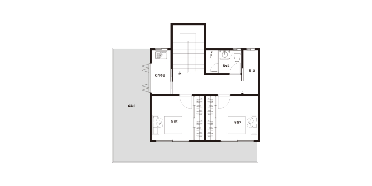 | 2F | 2층 구성: 창고, 침실2, 침실3, 욕실2, 간이주방 |