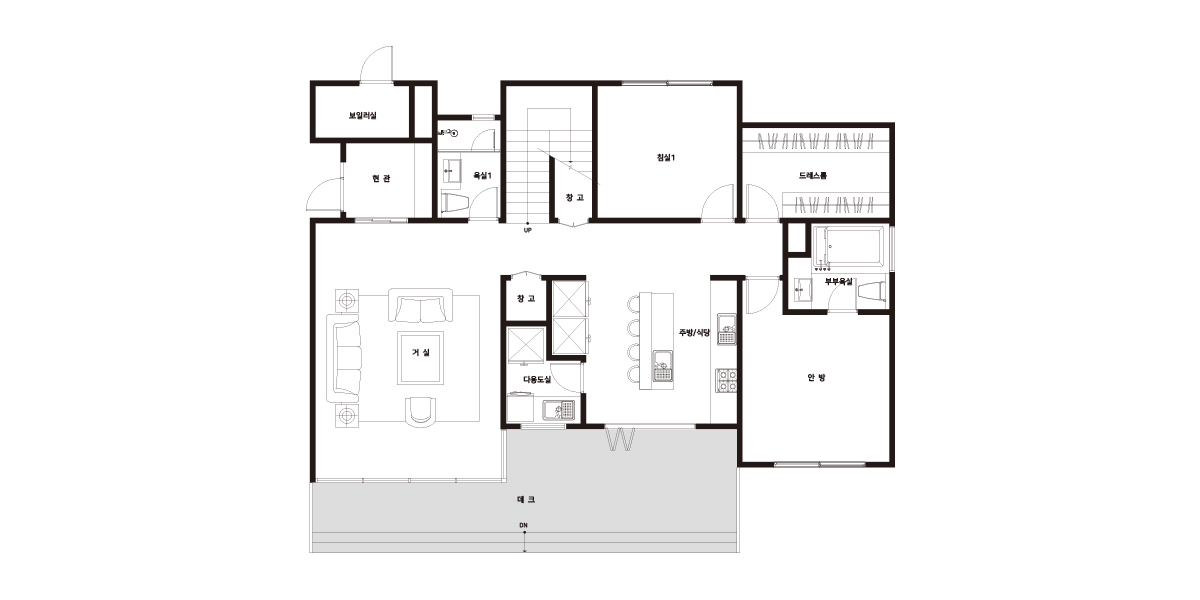 Floor Plan| 1F | 1층 구성: 현관, 거실, 주방, 식당, 창고, 안방, 드레스룸, 부부욕실, 다용도실, 보일러실, 침실1 |